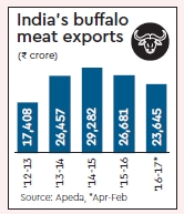 In 2014-15, buffalo meat became the largest item in the agri-export basket, surpassing basmati rice exports for the first time. In 2015-16, buffalo exports amounted to `26, 681 crore against the shipment of Rs 22,714 crore worth of basmati rice.