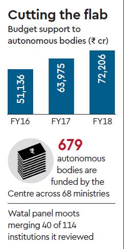 A third of the government-funded autonomous bodies may either be wound up or merged with others while several others may have to stand on their own feet, as the government is embarking on an overhaul of these bodies to cut wasteful spending. A committee headed by former finance secretary Ratan P Watal has found much scope for reducing these bodies’ flab, even as it is undertaking an administrative ministry-wise cost-benefit analysis of them. There are as many as 679 such bodies directly funded by the Centre now — up from less than 50 in 1950s — as successive governments have created new organisations aimed at promoting research, higher education, welfare and regulatory wherewithal. While a large number of these are contributing in good measure to nation-building, several have outlived their utility and become a drain on the exchequer.