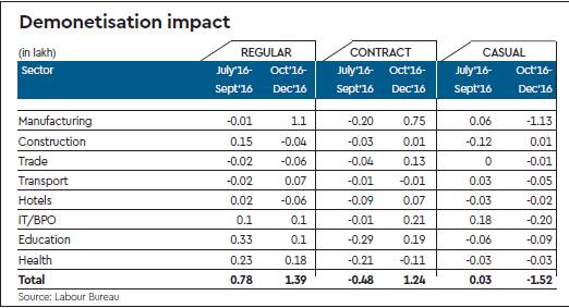 Casual workers were among the worst hit by demonetisation, which came into effect from the midnight of November 8, 2016. According to Labour Bureau data, around 1.52 lakh casual workers engaged across eight sectors, including manufacturing and IT/BPO, lost their jobs during the three-month period of October-December, 2016.