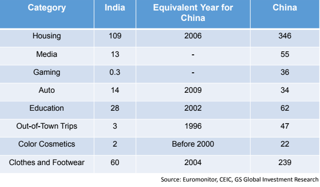 Not just housing, India is trailing China in every major category — education, auto, clothes and footwear et al by several years. The Lloyd George Management presentation showed that India’s maximum per capita consumer expenditure was on housing, followed by clothes and footwear. India’s per capita expenditure on clothes and footwear was $60. China spent this amount in 2004. China’s 2015 per capita consumer expenditure on clothes and footwear stood at $239 — nearly four times that of India.