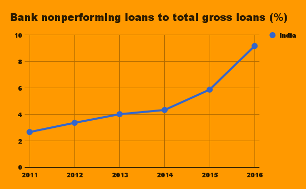 According to the latest available World Bank nonperforming loans data, India’s loan defaults were at staggering 9.2% of the total gross loans in 2016, second-highest in Asia after Pakistan (11.3%). A loan becomes non-performing or bad when a borrower stops repaying either the principal amount or the interest. According to the data on bank nonperforming loans by different countries maintained by the World Bank, India’s picture is not just bad but it is also worrying. India’s bad loans have surged drastically in the past six years. In 2011, India had just 2.67% of bad loans, which surged to 5.88% in 2015. The sharpest rise came in 2016 when the bad loans shot up to 9.18%.