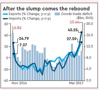 In a comfort for policymakers, non-petroleum and non-bullion exports in March rose an impressive 26%. Even non-oil imports in March jumped a massive 33.21%, suggesting the growing appetite of the economy. Interestingly, exports of meat, poultry and dairy products grew almost 17% to $429.8 million despite a crackdown on illegal abattoirs in Uttar Pradesh, which accounts for a bulk of the country’s beef exports.