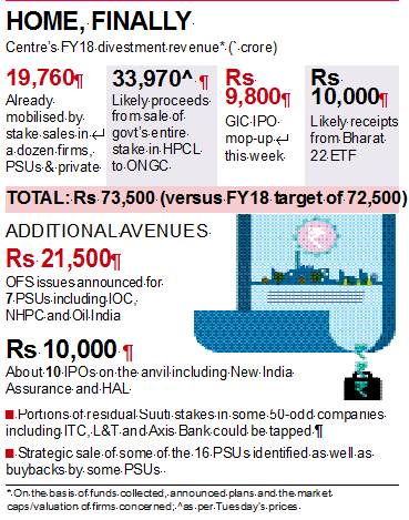 A windfall from the planned sale of the government’s entire equity stake in oil refiner/marketer HPCL to state-run explorer ONGC is the primary reason the overall disinvestment target looks set to be achieved this fiscal without mush hassle. A handsome amount of `34,000 crore will reach the coffers due to this transaction alone while the reinsurer GIC Re’s initial public offering (IPO) will fetch around Rs 10,000 crore. A new diversified, 22-stocks exchange-traded fund (Bharat 22) is sure to do well and garner at least `10,000 crore.