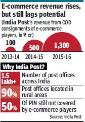 At present, areas covered by close to a half of the PIN (Postal Index Number) codes in the country are beyond the reach of e-commerce players. While there is no regulatory hurdle for post offices to handle consignments of e-commerce companies now, India Post has to liaise with such players more aggressively, rationalise staff in remote areas and deliver items even faster (at reasonable rates) to be able to grab more orders from them, a senior government official said. “India Post has to firm up a long-term strategy fast and make suitable changes internally to tap e-commerce. It has started taking orders from e-commerce players, but miles to go,” said the official.