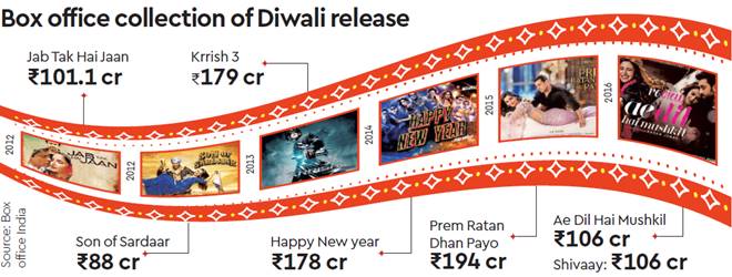 Multiplex operators too are hoping Diwali will be a good season. Analysts at research firm Edelweiss say that after a dull Q1 and Q2 FY18, when footfalls at major multiplexes were subdued, possibly because audiences did not appreciate the content, the current season could be better. Industry experts point out that unlike in the 1990s or early 2000s, several blockbuster films are released around Eid or Christmas or even Independence Day. Indeed, some of the biggest grossers have hit the screens during Christmas, with producers cashing in on the holiday season. In terms of collections, Eid has probably overtaken Diwali, say industry watchers. Nevertheless, the October-December period is turning out to be the best season for the film industry with attendance at its highest. Kamal Gianchandani, CEO, PVR Pictures and chief of strategy, PVR, observes that during the festive season Hindi films contribute 70-75% to revenues while English films contribute 15%. In CY2016, the Indian film industry grew just 3% to reach Rs 14,230 crore, according to a Ficci-KPMG study. The contribution from domestic theatricals fell 1.6% to Rs 9,980 crore while cable and satellite rights also witnessed negative growth. Thakkar points out that with average ticket prices having stayed at Rs 183 in the past few years and few screens being added, screen owners haven’t seen an increase in revenues despite some big-ticket releases. “With a 4.5% rise in the ATP (average ticket price), theatres should clock better revenues,” he said.