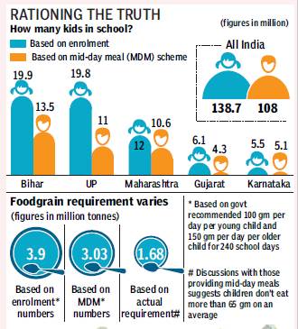 According to a performance audit of MDM by the CAG, while state governments reported a total of 138.7 million children as enrolled in schools, based on the number getting mid-day meals, there were only 108 million. The gap is even higher in certain states like Uttar Pradesh where, as compared to 19.8 million children enrolled, those appearing for meals is a much lower 11 million. After its performance audit, the CAG had said “audit evidenced an institutionalised exaggeration of figures regarding students availing MDMs”. In other words, the gap may be even higher.