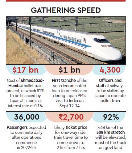 Taking India’s first bullet train closer to reality, work on the Mumbai-Ahmedabad project will commence soon, with the first tranche of $1 billion from a total loan of about $14 billion to be released during the visit of Japanese Prime Minister Shinzo Abe to the country on September 12-14. The $17-billion high-speed railway line of 508 km, which will be built on Japan’s Shinkansen technology, is expected to be operational by 2022-23, India’s 75th year of independence.