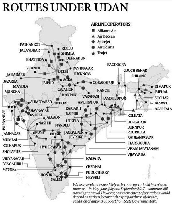 The airports that would be connected under UDAN include Bhatinda, Shimla, Bilaspur, Neyveli, Cooch Behar, Nanded and Kadapa. On each flight, 50 per cent of the seats would have a cap of Rs 2,500 per seat/hour, Choubey said. Under UDAN, the operators would be extended viability gap funding — for which money is partly raised through a levy of up to Rs 8,500 on flights operating on major routes like Delhi and Mumbai.