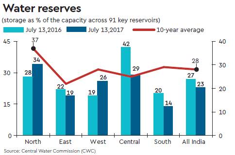Six weeks into south-west monsoon season, average water level at country’s 91 large reservoirs remained below what it was a year ago and the average of last ten years, reflecting uneven distribution of rains. According to Central Water Commission (CWC) data released on Thursday, even as 6 reservoirs located in northern states have reported water levels at 34% of their holding capacities against 28% last year, overall water table in key reservoirs across the country have been at 23% of their capacities. A year back the average water table was 27% of capacities while 10 year average of water table is 28% of capacities.