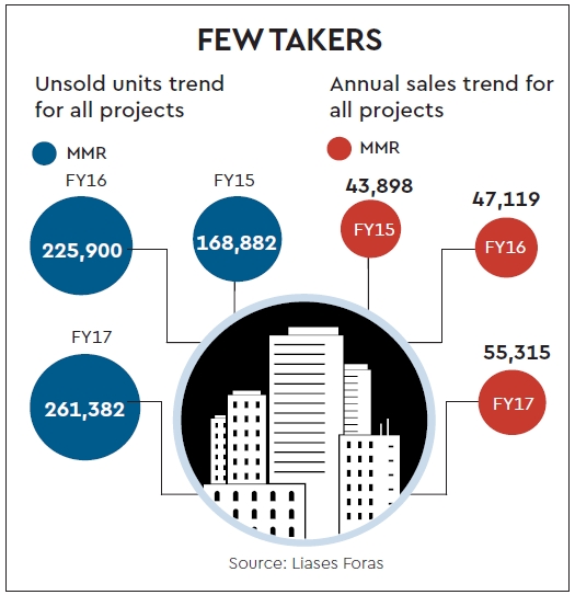Kapoor points out that the poor velocity of sales is the consequence of high property prices partly driven up by an increase in input costs. Indeed, while the homes are not really large — between 500 square feet and 1,000 square feet — the weighted average price per square foot is as much as Rs 13,000, data sourced from Liases Foras show.