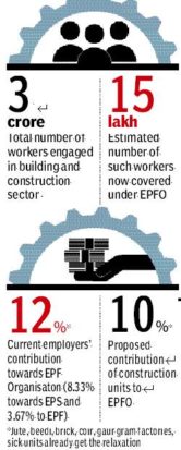 The labour ministry feels that by reducing the quantum of employer’s contribution, it can persuade more building/construction units to extend the EPF benefits to workers. The construction industry has been pitching for this relaxation, contending that the current level of EPF liability was too onerous for it, especially since the units already pay 1% of the construction cost to the government as labour cess.