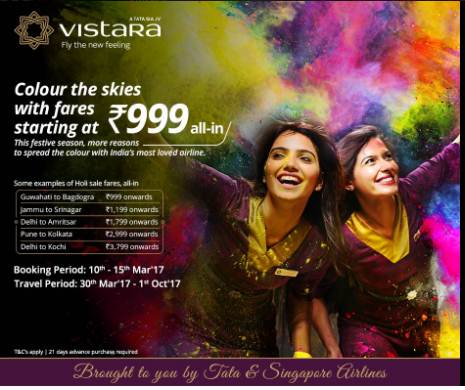 Vistara has reduced the prices of fares, with its aim to to attract more air passengers during the Holi season. The festival of colours is on Monday. The airline is eyeing to attract more passengers planning to go to their destinations from March 30-October 1. Pasengers who will be travelling between this period can book their tickets between March 10-15.