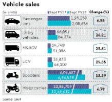 Market leader HMSI posted a growth of 8.65% in scooter sales last month at 3,86,456 units. Chennai-based TVS Motor clocked 1,18,174 units, a jump of 50.47% from the year-ago month. Hero MotoCorp’s scooter sales were at 88,524 units, up 5.4%. Sales of commercial vehicles rose by 25.27% to 77,195 units in September. This was the highest growth rate achieved since November 2011 when CV sales had grown by 34.17%.