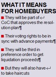 Once the homebuyers get the status of financial creditors, their representatives will be part of the committee of creditors that approves an insolvency resolution plan, failing which a stressed firm goes for liquidation. Their voting rights will be proportionate to the value of their advances, said the sources.
