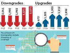 At 10 a day, it’s been raining downgrades over the past year. Rating agencies have, between them, announced a staggering 3,500 downgrades in 2016-17, an all-time high. And at just over 1,800, the number of upgrades was the lowest since FY14, Bloomberg data show. After Lodha Developers, Reliance Communications and Tata Steel in January and IFCI and IDBI Bank in February, Tata Teleservices and Janalakshmi saw their ratings drop in March. The ratio of downgrades to upgrades of 1.52 in 2015-16 worsened to 1.94 in 2016-17.