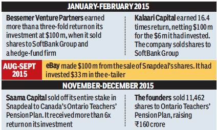 Bahl and Bansal aren’t the only ones to have profited from the sale of stake. According to documents viewed by FE, Kalaari Capital which invested just $6 million earned a return on investment of 16.4 times. Similarly, eBay which invested $33 million in Snapdeal in 2014, made a quick partial exit a year later. eBay pocketed a return that was three times its investment of $100 million.