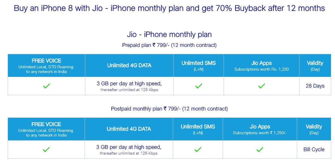 – Jio – iPhone monthly plan Prepaid plan Rs 799/- (12 month contract)