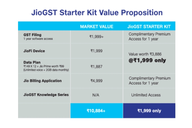 How to get the JioGST Starter Kit: Log on to the website Jio.com and order the starter kit. Then visit any Reliance Digital/DX Mini /Jio Store to get the Jio SIM. When you get both the device and the starter kit, got to the website JioGST.com. Here you can select your GSTIN, and then pair your JioFi MSISDN in order to activate you JioGST Starter Kit.