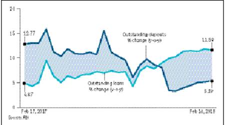 Non-food credit grew 11.59% year-on-year (y-o-y) in the fortnight ended February 16, marginally below 11.89% in the previous fortnight. According to provisional data released by the Reserve Bank of India , outstanding loans to companies and individuals stood at Rs 82.06 lakh crore on February 16 against Rs 82.11 lakh crore on February 2. Non-food bank credit had recorded a 4.87% y-o-y growth in the year-ago period, when the demonetisation exercise had just ended and bank staff were just beginning to return to normal loan-disbursement functions. The net corporate bonds outstanding, as at the end of December, was Rs 26.47 lakh crore, up 16% from Rs 22.77 lakh crore at the end of December 2016, as per data released by the Securities and Exchange Board of India (Sebi). Data from RBI showed that the net outstanding on commercial papers stood at Rs 4.89 lakh crore as on February 15, up 21.6% from Rs 4.02 lakh crore as on February 15, 2017. Taken together with the outstandings on corporate bonds and CPs, the total outstanding credit in the system adds up to around Rs 113.42 lakh crore, up 12.78% from Rs 100.57 lakh crore in the comparable period last year. Data on outstandings on corporate bonds for January and February are not available yet.
