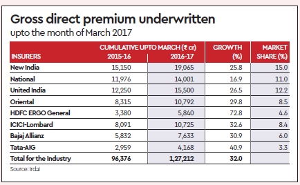New India Assurance had the highest market share at nearly 15% and saw its gross direct premium at `19,065.07 crore, a surge of 25.85% in the last financial year. While among private sector insurers, ICICI Lombard had a market share of 8.43% and saw it grow 32.56% at `10,725.19 crore in gross direct premium.