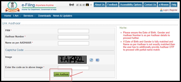 Taxpayers need to visit the incometaxindiaefiling.gov. in website and click on the link on the Left Pane – ‘Link Aadhaar’. After clicking on this link, you will be directed towards the next window where you need to provide the details of PAN and Aadhaar card.