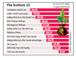 Sundaram Small Cap Fund, HSBC Small Cap Equity Fund and Aditya Birla Sun Life Small Cap Fund are among the worst-performing equity schemes over the past year, having lost anywhere between 21% and 24%. Several large-cap funds such as JM Core 11 Fund, IDBI India Top 100 Equity fund and DSP Top 100 were laggards among the large-cap category, giving negative returns in the range of -8 to -11.90%.