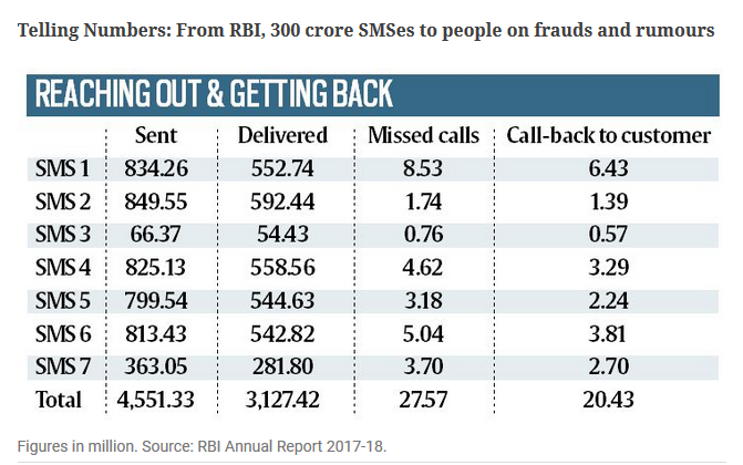 With an aim to educate the public about frauds, fictitious offers and rumors, RBI launched an awareness campaign in November last year. Till date, RBI has sent SMSs to millions of mobile phone subscribers across the country. More than 3,000 million text messages were received by the customers between November 10, 2017 and June 30, 2018, the latest released RBI annual report said. In total, seven different messages formed the part of the campaign.