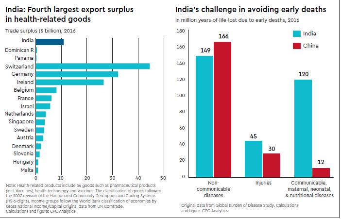 In August 2017, 290 children died in Gorakhpur’s government-run BRD Medical College, primarily due to the lack of oxygen cylinders and a poorly functioning neonatal wing. In the same month, 49 children died in another public hospital in the same state due to medicine shortage. These incidents represent only a small fraction of a much bigger problem with healthcare in India, the lack of health equipment and medicines in hospitals. At the same time, the Indian health economy has been one of the most striking stories of the country’s industrial development. Analysis of an expansive dataset on trade in goods shows that, in 2016, India exported health-related goods worth $14.1 billion, whereas the imports were about $3.2 billion—an export surplus of almost $11 billion. Only three countries in the world had a higher export surplus in health-related goods: Germany, Switzerland and Ireland (see figure). India is the only country among the low- and middle-income countries that has achieved a sizeable trade surplus in the sector, with a dynamic growth rate in exports of 9.8%. Meanwhile, imports have remained constant. The positive reading of these figures is that the Indian health economy is globally competitive. It does not come by coincidence that analysts have called India’s pharmaceutical industry the ‘supplier to the world’. The IBEF, or India Brand Equity Foundation—the government-funded trade promotion organisation—stated that the health sector has become one of the largest sectors in the Indian economy in terms of revenue and employment.