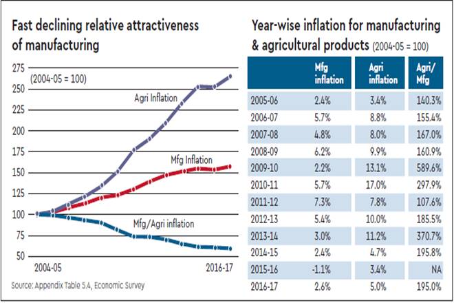 Indian manufacturing is not high tech where heavy engineering, high-end electronics, aircraft and spacecraft, shipbuilding, etc, dominate. It is relatively low- to medium-grade in its maturity. It has a heavy dominance by industries that prepare or convert produce from agriculture for domestic consumption. For example, textiles sector (the biggest industry by employment) is dependent on agriculture for cotton supplies and silk, which can account for about 60% of final product costs. Similarly, sugar industry is dependent on sugarcane; cigarette on tobacco; beedi industry on tendu leaves and tobacco; vegetable/cooking oil industry on sunflowers, groundnut, sesame; food processing industry on wheat, maize, fruits, fish, poultry; and dairy industry on milk. Roughly 40-45% of the Indian manufacturing sector depends upon agriculture for inputs, and a few more on inputs from mining. It is important to maintain a balance between input and output prices in these sectors, and they should ideally move in tandem if the manufacturing sector has to stay attractive for investments. In India, since agriculture feeds industry and industrial final goods are sold to those in rural and agriculture areas, any persistent imbalance could hurt both. Our manufacturing prices are down 41% since 2004-05 in relative terms The terms of trade in international trade mean the prices a country gets for its basket of export goods versus what it pays for its imports and how the relative price moves over a period of time. In domestic trade, it means how the prices that a sector gets for its output moves in relation to the prices it pays for its inputs from other sectors. Since 2004-05, the terms of trade have been relentlessly moving against manufacturing. If the manufacturing sector has had to pay 165% more for its key inputs from the agricultural sector, it has been able to recover just about 57% from its customers. If agricultural input prices are taken as the base, the manufacturing sector is getting nearly 41% less today for what it sells to other sectors compared to what it pays for agri inputs (see chart). At one level, it helps transfer of income from non-agriculture sectors to rural and agriculture sectors, and thus corrects income skewness. But a consistent increase of this magnitude has continuously eroded the margins of the manufacturing sector to unattractive and unsustainable levels, leading to lack of enthusiasm in investing.
