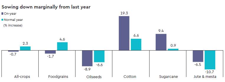 This has impacted sowing. As compared with last year, sowing is lower for foodgrains and oilseeds. Even the government’s first advance estimates say that kharif foodgrains production could be 2.8% lower than last year. Oilseed production could drop by around 8%. The decline is also because last year had seen a sharp increase in both the sowing area and production of most crops.