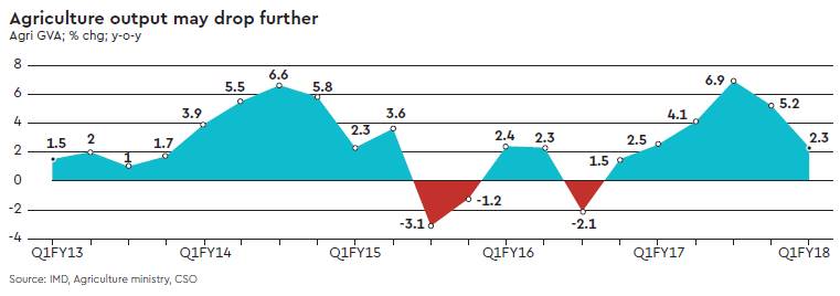 Given the volatility in farm prices, farm income remain stressed. In the three months to June 2017, agriculture GVA slowed to 2.3%, the slowest since March 2016. Kharif crop constitutes around 50% of overall farm output and any shortfall in production will reflect in lower agriculture GVA growth unless it is made up by rabi crops. Also, industries like textiles, edible oils, sugar, seeds, fertilisers, tractors and farm equipment have strong links with agriculture output.