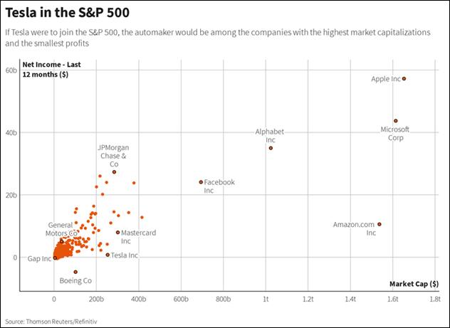 With a market capitalization of about $250 billion, Tesla would be among the most valuable companies ever added to the S&P 500, larger than 95% of the index’s existing components. It would have a major impact on investment funds that track the index.