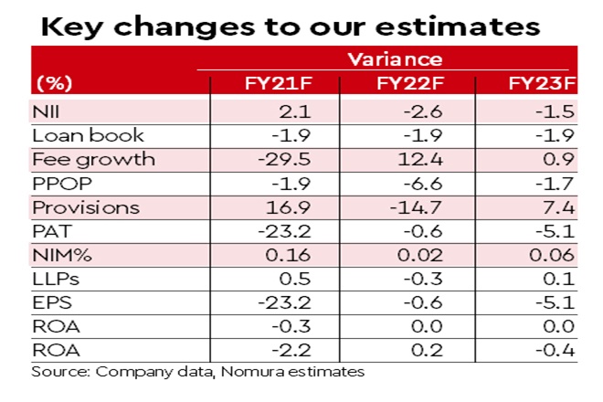We build in credit cost of 310/190bp for FY21/22F, normalising to 140bp in FY23F and build in loan growth of 4%/12% for FY21/22F with ROEs of 8%/12% in FY21/22F normalising to 14% in FY23F. Current valuation at 1xFY22F P/BV is inexpensive especially in the context of improving granularity of B/S and P&L. We hence maintain Buy and raise our TP to Rs 725, implying 1.2x Sep-22 book.