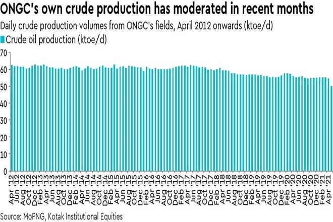 In Q4FY21, crude oil sales volumes declined 4% y-o-y to 5.22 mn tons reflecting 5% reduction in production from own fields. Gas sales volumes declined 6% y-o-y to 4.39 bcm reflecting 9% lower production from own fields, which was offset by 21% rise in JV production. VAP sales volumes declined by 16% y-o-y and 7% q-o-q to 0.73 mn tons. OVL’s production remained weak declining 13% for crude oil to 2.03 mn tons and 12% for gas to 1.12 bcm.