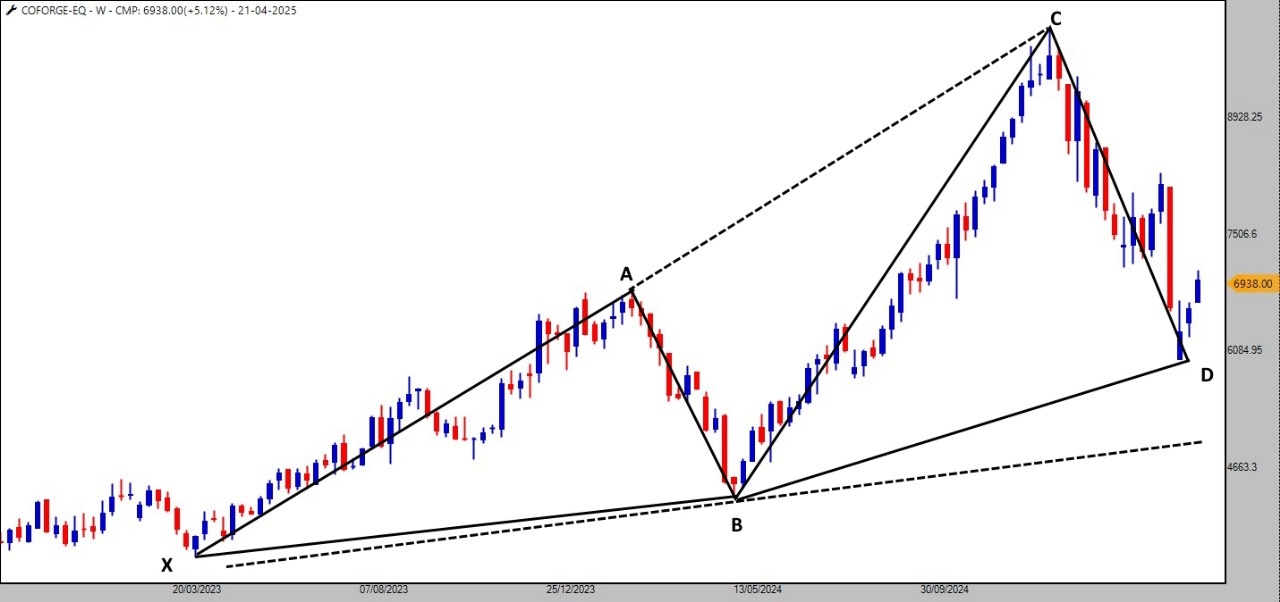 A Bullish White Swan harmonic pattern is visible on the weekly chart, suggesting a reversal is on the cards. Adding to this, a bullish belt hold pattern has formed at the reversal zone, providing additional confirmation that Coforge may witness potential upside rally in the coming weeks.