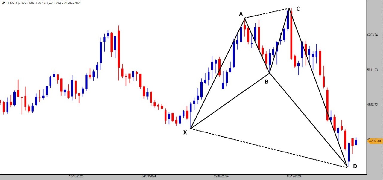 A Bullish Nen-Star harmonic pattern is visible on the weekly chart, hinting at a trend reversal. A long-bodied bullish candle appearing right at the reversal zone strengthens the conviction that LTIM could potentially be gearing up for a significant upside move.