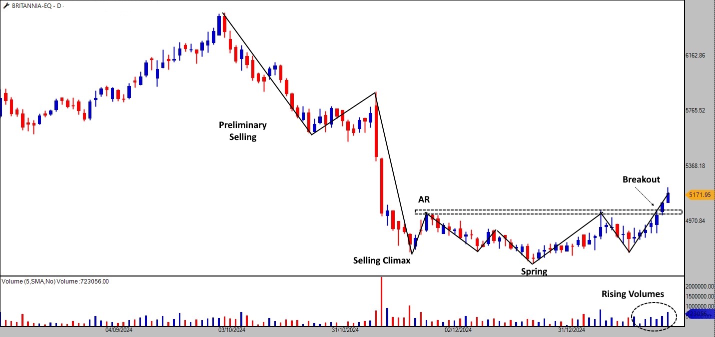 Britannia’s daily chart shows that the stock is bottoming out, showing signs of a potential reversal. According to Wyckoff’s theory, the stock is currently in the accumulation phase. This is a phase where institutional investors typically buy into the stock after it has reached a low point, or what is referred to as the “spring” or “shakeout”. In this phase, weak hands are shaken out of the stock, and the strong hands accumulate shares at attractive levels.