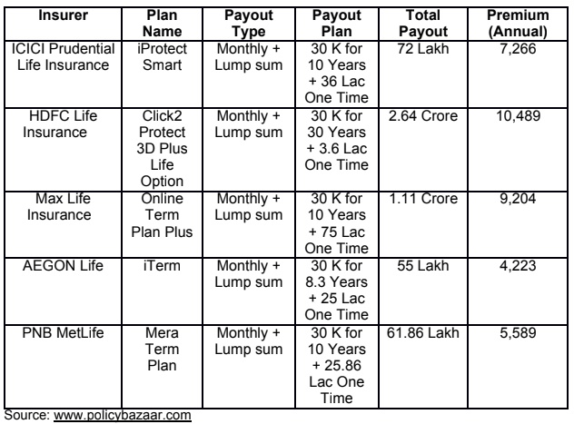 The following is a comparative table of 5 leading insurance companies providing term insurance of Rs 1 crore sum assured for a non-smoker, 30-year-old man who earns between Rs 5 and Rs 7 lakh annually. The duration of term is 30 years and the payout method is lump sum + monthly income.