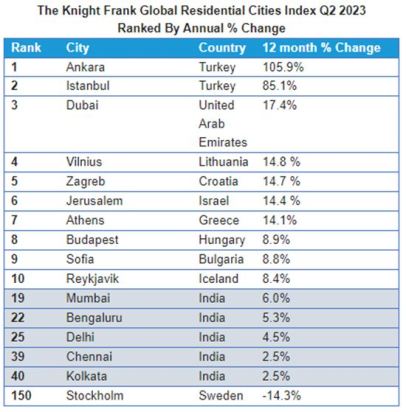 The Turkish capital Ankara leads Knight Frank’s Global Residential Cities Index Q2 2023 with the highest growth rate of 105.9%, followed by Istanbul at 85.1%. Stockholm ranked the lowest in terms of price appreciation (-14.3.0%) on the Global Residential Cities Index.