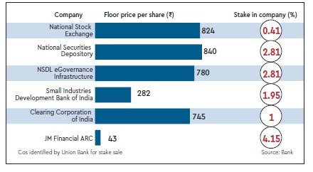 Union Bank of India has put up for sale its stakes in six companies to raise around Rs 700 crore, according to a sale document. The public-sector lender has invited bids for its 0.41% stake in National Stock Exchange (NSE), 2.81% each in National Securities Depository (NSDL) and NSDL eGovernance Infrastructure, 1.95% in Small Industries Development Bank of India (Sidbi), 1% in Clearing Corporation of India (CCIL) and 4.15% in JM Financial ARC.