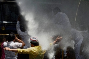 Delhi Congress members brave water cannons as they protest against Delhi Chief Minister Arvind Kejriwal in New Delhi on Wednesday.…