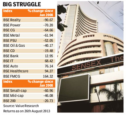Except for FMCG, auto, IT and pharma, all sectoral indices have declined in the last five years. The realty index (-90%), power (-70.20%), capital goods (-64.66%), metal index (-61.94%), PSU (-52.05%), Oil & Gas (-40.17%) and consumer durables (-19.48%) have taken a beating.