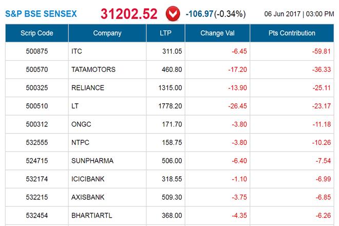 03:00 pm: The shares of ITC (-59.81 points), Tata Motors (-36.33 points), Reliance (-25.11 points), L&T (-23.17 points), ONGC (-11.18 points), NTPC (-10.26 points) contribute the most in the down surge of Sensex. The benchmark trades lower, down 0.34% or 106.97 points at 31,202.52 points.