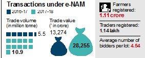 The government hopes that volume of trade will further increase once warehouses supplement as mandis, as traders may prefer to buy from there instead of a mandi to save on arhtiya commission. The traded volume of agricultural produce on e-NAM nearly doubled to 10.9 million tonne in 2017-18 from 5.5 million tonne in 2016-17. The traded value has also gone up to Rs 28,255 crore in the last fiscal from Rs 13,274 crore in 2016-17, according to official data.