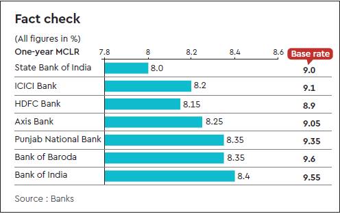 State Bank of India (SBI), the country’s largest lender, reduced its one-year MCLR by 120 basis points (bps) between April 2016 and January 2017 to 8%. Its base rate has fallen by a mere 30 bps between April 2016 and August 2017 to 9% — a full percentage point higher than the one-year MCLR.