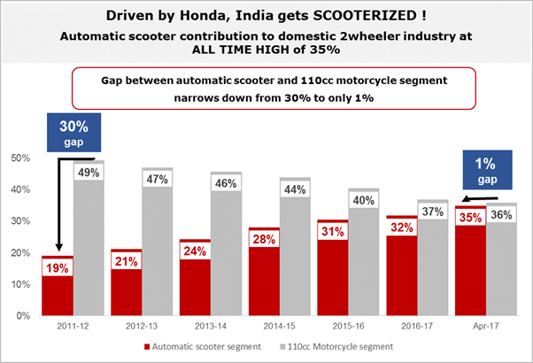 In last 6 years, the demand of automatic scooter has increased at a rapid pace and due to this 35 percent of the domestic two wheeler segment is ruled by automatic scooters. The 110cc motorcycle segment contribution has declined from 49 percent to 36 percent in the same period. With the momentum expected to remain with scooters, soon we could see scooters emerging as the largest shareholder in the two-wheeler segment in India.
