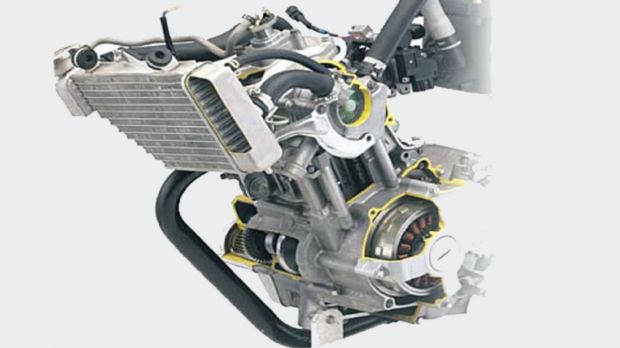 Oil-cooled engines are similar to air-cooled engines, as they still retain the cooling fins to channel air, however, they do get a small oil-cooler mounted externally that helps passing air cool the engine oil. The hot engine oil is passed through this radiator, which uses air to cool the oil and is pumped back into the engine.