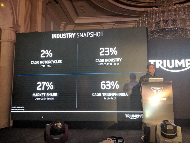 11:47 am:Â Out of the two percent growth rate of two wheelers in India, The 500 cc plus segment is over 20 percent and Triumph India commands 64 percent of the share