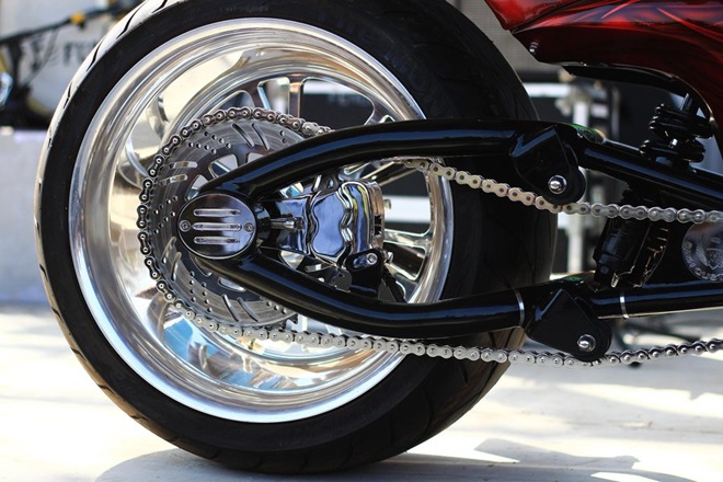 Pinstriping and airbrushing of the Apple Candy paint job with flames were also done in-house. Now, coming to a very eye-catchy bit about the Da Bang – tyres. It gets 310 mm in the front and 360 mm in the back – world’s fattest tyre. And to accommodate the fat tyre, the swingarm was also custom built.