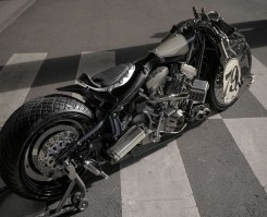 Right in the face of the modified Harley-Davidson Monster are a pair of alien looking headlamps that make it look meaner. With the hand-beaten bodywork and textured brass rings providing an organic element that brings it all to life.